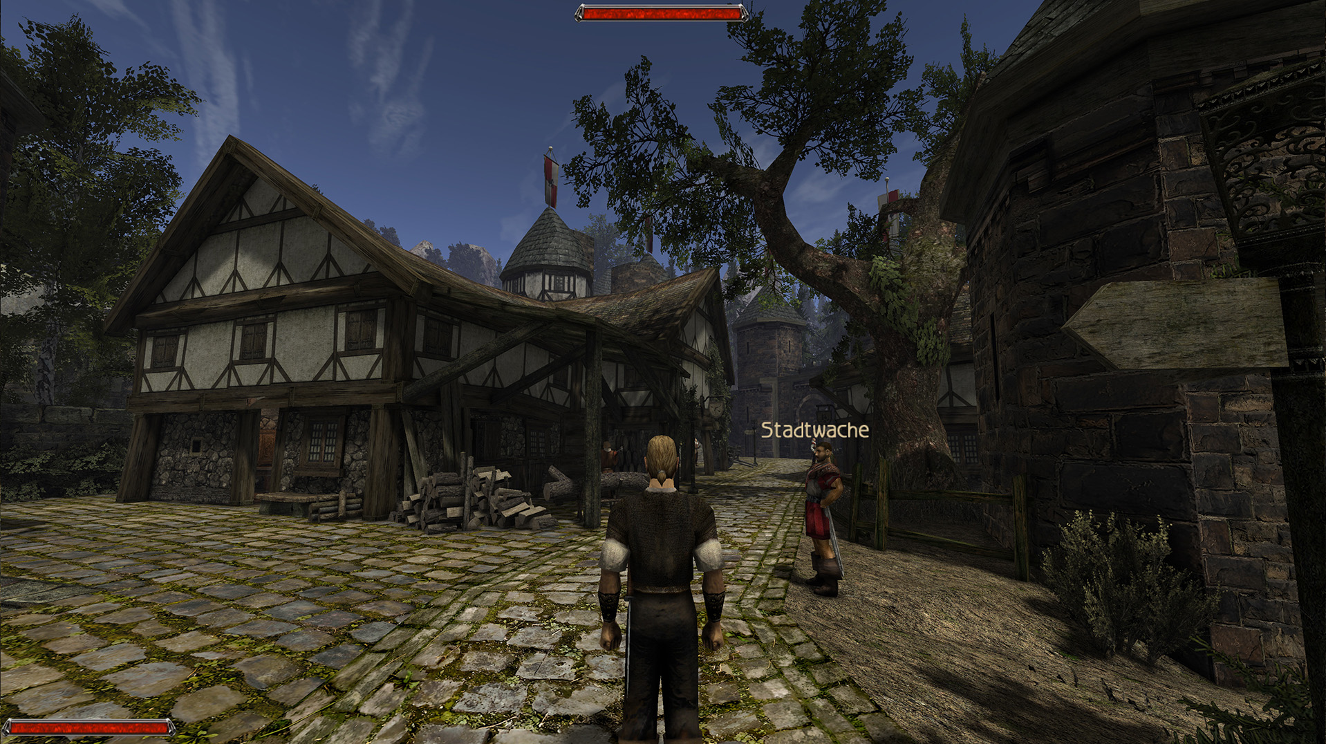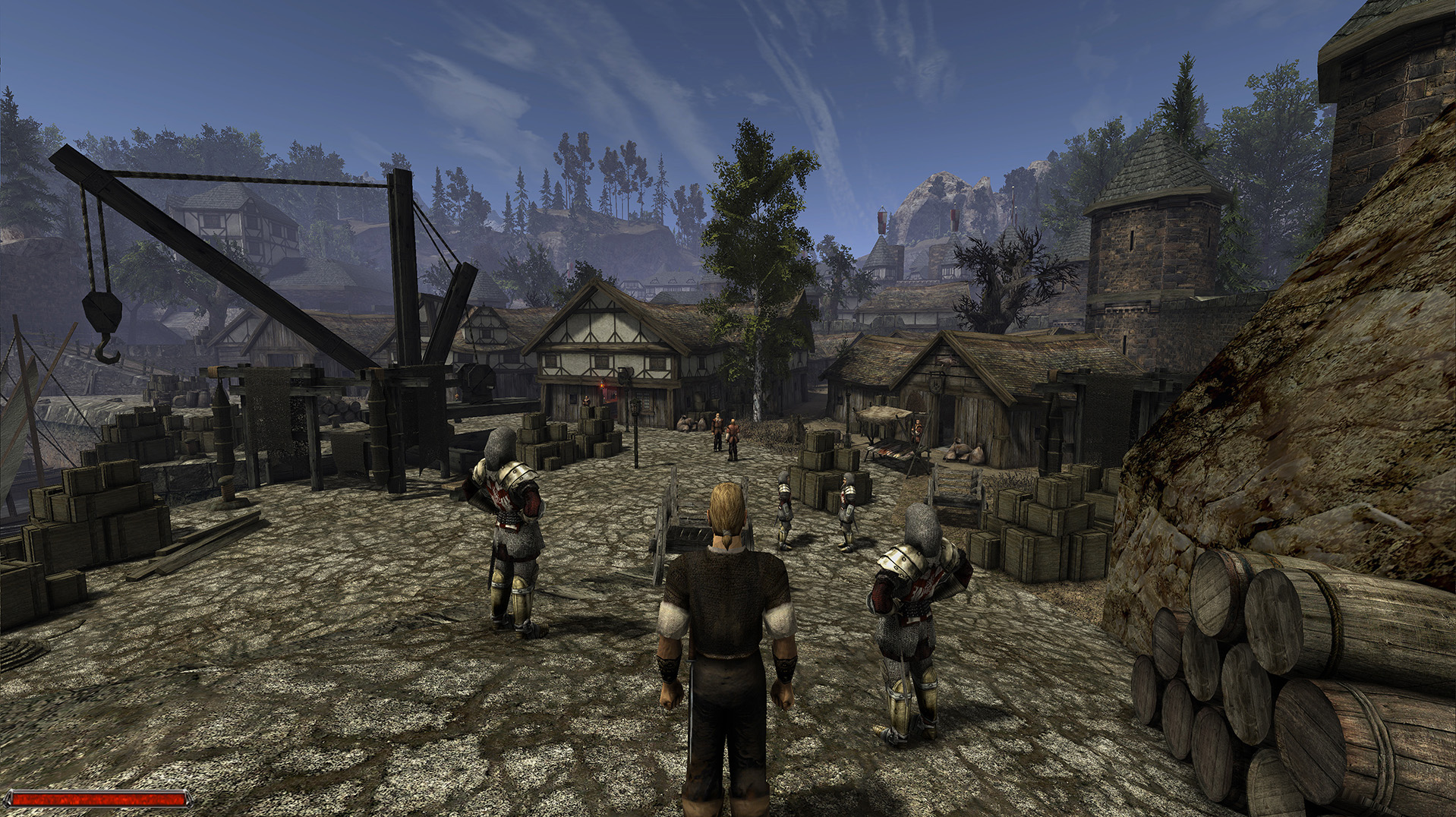 Wer mit dem Konzept der Strafkolonie nichts anfangen kann, für den lohnt sich ein Blick auf die Fortsetzung. Denn hier finden wir alles, was das Mittelalter-Herz höherschlagen lässt: Mit Khorinis bekommen wir ein wirklich hübsches, kleines Mittelalterstädchen mit Hafenviertel, Handwerkerstraße und Taverne. Bewacht von Paladinen in glänzenden Rüstungen. Im Umland dann dichte Wälder, Klöster und Bauernhöfe.